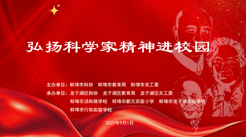 9月1日开学第一天,蚌埠市“弘扬科学家精神进校园”系列活动顺利举行。活动由蚌埠市科协、市教育局、市关工委主办,龙子湖区科协、区教育局、区关工委、蚌埠市汤和路学校、蚌埠市新元实验小学、蚌埠市龙子湖实验学校、蚌埠市行知实验学校共同承办,以“弘扬科学家精神”为主题,遴选“这,才是我们该追的星”弘扬科学家精神演讲比赛优秀选手,组成蚌埠市弘扬科学家精神宣讲团,走进蚌埠市中小学,全方位、多角度、立体化宣讲科学家的感人故事。市关工委常务副主任张军、市科协副主席常芳、承办单位负责同志等出席活动。