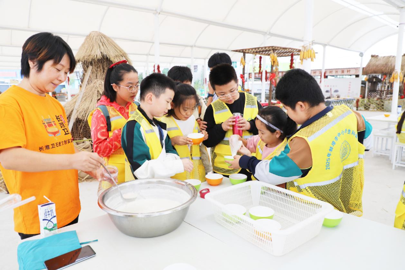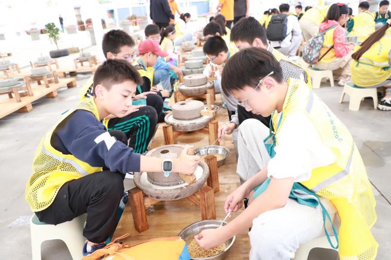 在石磨文创实践基地,讲解员既介绍石磨传统构造与文化,也讲解其从“农耕工具”到“文创载体”的创新转型;大家分组现场体验研磨豆浆并品尝自己的劳动成功,亲身触摸“传统+创新”的成果,领会“创新赢得未来”。
