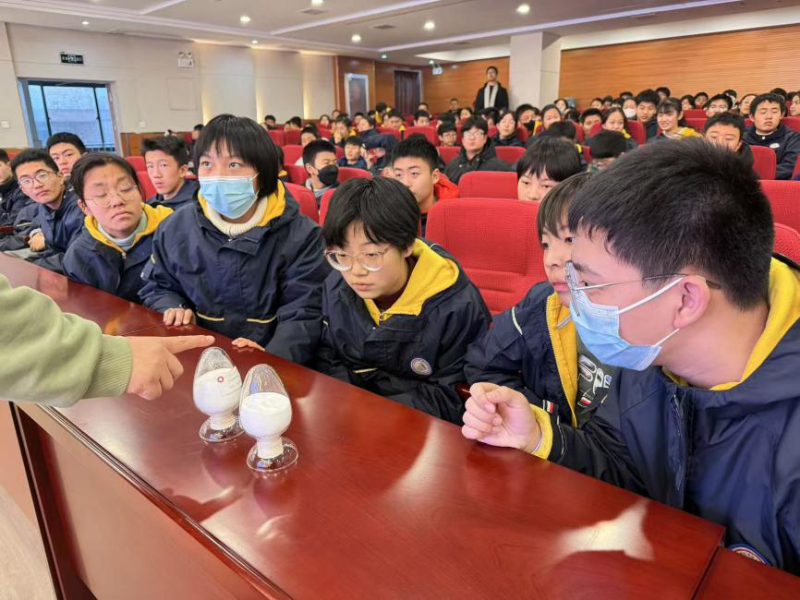 “同学们,你们知道最早的玻璃是怎么出现的?是谁制作的吗?需要哪些原材料?”讲座深入浅出地揭示了玻璃的“蜕变”。从日常生活中的瓶罐,到支撑现代信息社会的光纤玻璃;从守护建筑节能的Low-E玻璃,到让折叠屏手机自由开合的柔性玻璃;从广泛应用于航天器的高强度微晶玻璃,到被誉为“未来材料”的金属玻璃,其中特种玻璃里的舷窗玻璃,高强耐冲击玻璃是保障我国大飞机、高铁等“大国重器”建设,新能源汽车关键产业的重要关键材料……学生们惊奇地发现,玻璃早已突破传统范畴,成为高端制造、信息技术、新能源、生物医药等国家战略性新兴产业不可或缺的核心材料。