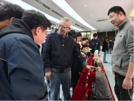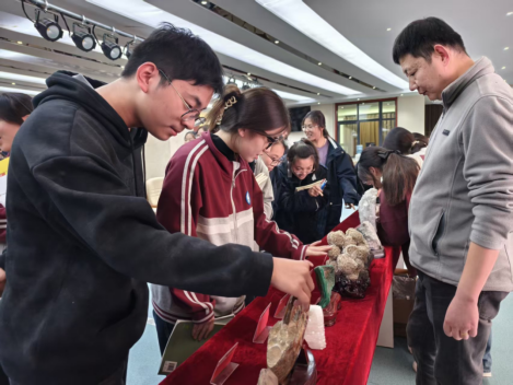 张教授团队带来的数十件矿物标本瞬间吸引了师生们的目光,大家纷纷驻足围观,好奇地询问标本的来源、成因与用途,张教授及其团队老师们耐心细致地逐一解答,现场互动氛围十分热烈,为讲座拉开了生动的序幕。