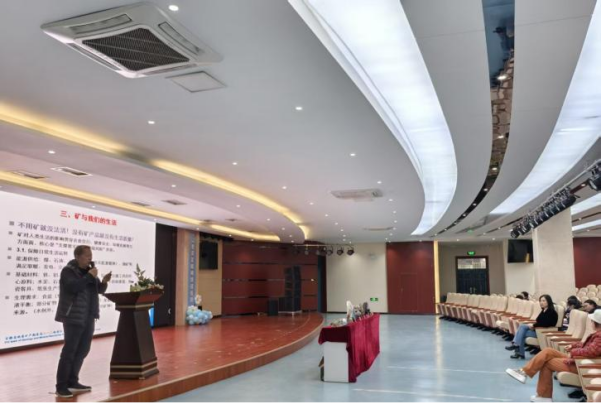 讲座中,张教授以清晰的逻辑、通俗的语言,围绕“什么是矿”“矿物与岩石的关系”“矿与我们的生活”“怎样找矿用矿”四大核心内容展开讲解。不仅系统阐释了矿产的天然形成、经济价值与可开采性等基础概念,还结合生活实例,让学生们了解到煤、石油等能源矿产如何支撑日常运转保障国家能源安全,铁、铝等金属矿产如何构建城市建筑,硅矿、稀土矿如何赋能科技产品,甚至食盐、石膏等矿产在饮食、医疗中的广泛应用。