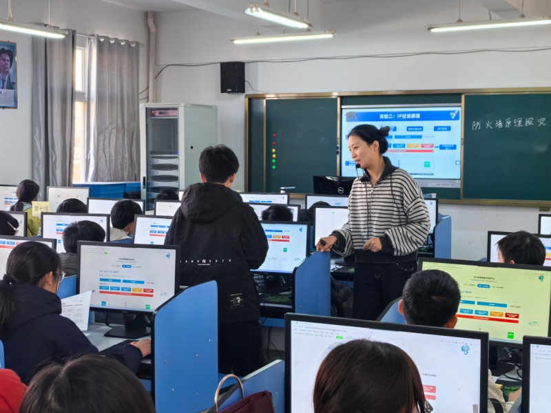 随后,蚌埠第八中学刘凯月老师展示了研讨课《探究数字长城——防火墙虚拟实验探究》。刘老师以校园生活片段为切入点,通过真实场景提问激发学生兴趣。课前她准备了《防火墙原理实验学习任务单》,并挑选操作能力较强的学生担任实验助手。课堂上通过三个虚拟实验,让学生在动手操作中直观理解防火墙工作机制,充分体现信息科技学科的实践性与趣味性。