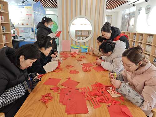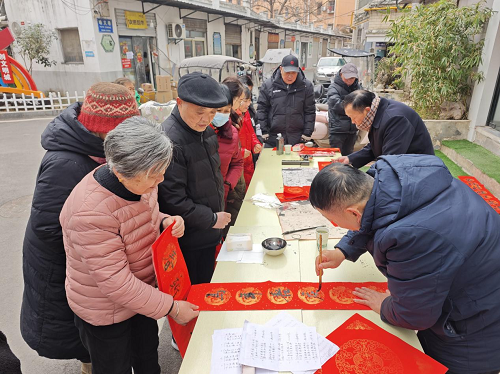 活动当日清晨,社区志愿服务广场早已装点一新,写春联、剪窗花两大民俗体验区前人头攒动,笔墨飘香与欢声笑语交织成冬日里最温暖的旋律。书法爱好者们挥毫泼墨,笔走龙蛇间,一幅幅寓意吉祥的春联跃然纸上,苍劲有力的“福”字铺满桌面,居民们围拢围观,有的驻足挑选心仪的春联,有的主动索要定制祝福语,拿到春联的居民脸上都洋溢着幸福的笑容。剪窗花区域更是热闹非凡,社区志愿者耐心细致地手把手教学,从折叠红纸的技巧到镂空裁剪的要领,一步步悉心指导,一张张普通的红纸在大家的巧手下,蜕变为栩栩如生的龙纹、寓意团圆的福字窗花、灵动可爱的生肖图案,现场一派其乐融融的景象。