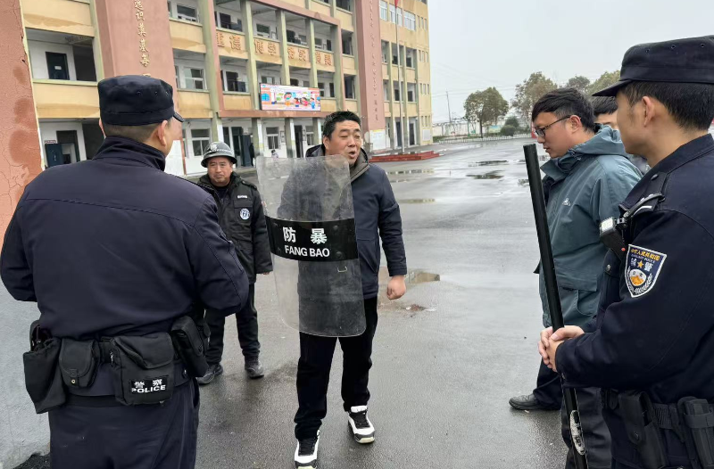 防暴演习中,工作人员模拟“暴徒”试图闯入校园,安保人员迅速启动学校既定应急预案,关闭伸缩门,手持防暴盾牌、钢叉快速形成防御阵形,同时第一时间上报信息。在派出所民警的专业指导下,学校机动应急小组与民警默契配合,按照“牵制——格挡—控制”的科学战术,将“暴徒”围困制服。