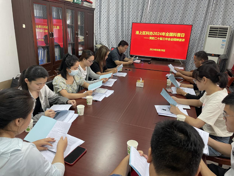 为深入学习宣传贯彻党的二十届三中全会精神,8月28日,淮上区科协开展了党的二十届三中全会精神宣讲活动,由淮上区群团党支部书记单标领学,乡镇及街道科协工作人员参加会议。