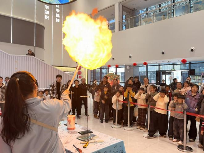 科学实验秀不停,趣味科普燃全场。年味实验室带来多场现象级科学表演:液氮的低温奇妙、氢气爆燃的震撼瞬间、激光爆气球的精准刺激、焰色反应的五彩斑斓轮番上演,直观展现低温物理、气体燃烧、光学特性、化学显色等科学原理。搭配趣味小零食体验环节,让科学知识可看、可感、可尝,孩子们目不转睛、踊跃互动,在惊叹声中种下探索科学的种子。