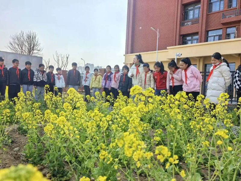 活动伊始,大队辅导员王蕊老师化身为“田园讲解员”。她站在田垄间,为队员们详细讲解了“知辛园”里各类蔬菜与花卉的生长习性。从破土而出的嫩芽到含苞待放的花蕾,王老师生动的讲解将“谁知盘中餐,粒粒皆辛苦”的道理具象化在每一片绿叶之上。队员们认真聆听,用心感受大自然的奇妙馈赠。