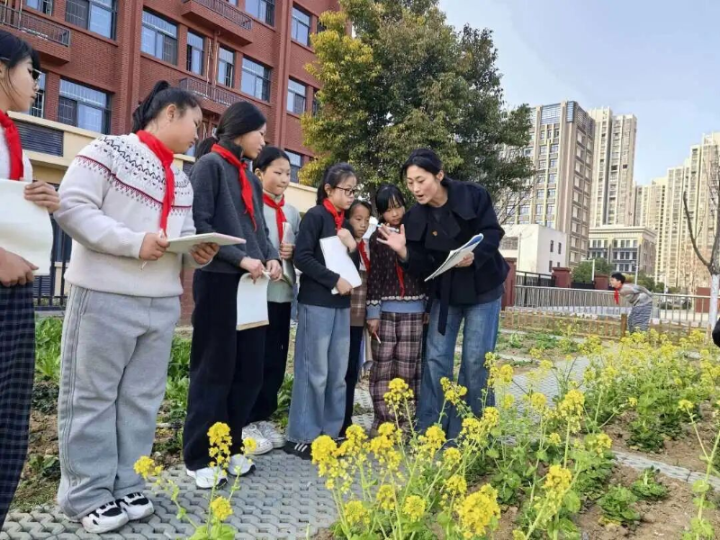 春光明媚,万物竞发。3月31日,临港新程实验学校的“知辛园”里小学部高年级的少先队员们佩戴着鲜艳的红领巾,在这片充满生机的劳动实践基地里,开展了一场别开生面的“田园写生”科普实践活动。