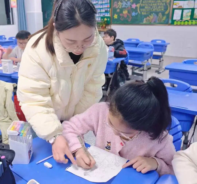 结束知辛园的实地写生后,大家带着满满的收获回到教室。党员教师张婉莉老师接过指导的接力棒,对队员们的写生作品进行细致点评与润色指导。从构图比例到色彩层次,张老师逐一耐心讲解,帮助队员们进一步完善画作,将园中的春色更好地呈现在画纸上。