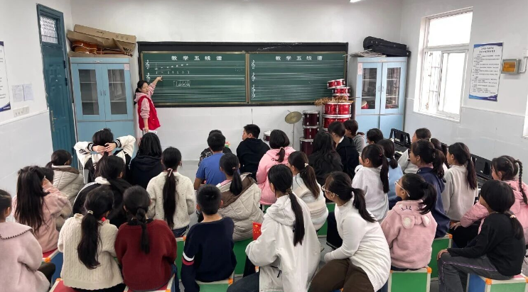 音乐教室内,孩子们围坐成圈,眼中满是对音乐的好奇与渴望。文化馆老师耐心讲解音符奥秘,从基础乐理到简单视唱练耳,逐步带他们走进音乐世界。黑板上“认识音符”的知识点工整清晰,抽象的do、re、mi也变得生动有趣。孩子们跟着拍手哼唱,稚嫩歌声回荡,满是纯粹热爱。对留守儿童来说,音乐不再是手机里的远音,而是触手可及的快乐,让艺术温暖贴近童心。
